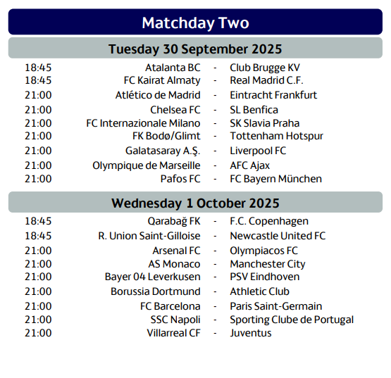 ⚽ Matchday 2 – 2025년 9월 30일(화) ~ 10월 1일(수)